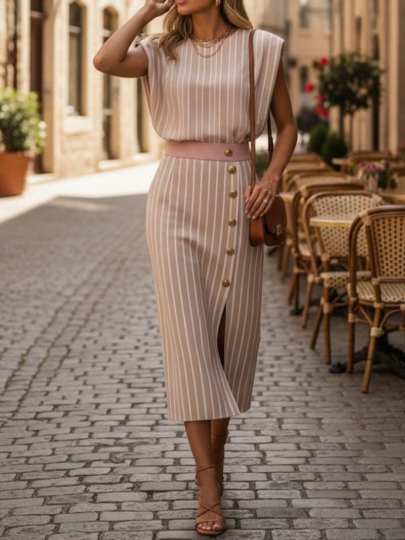 Sophisticated midi dress featuring a refined vertical stripe pattern, structured wide-shoulder sleeveless silhouette, and a flattering waist-defining design with decorative front buttons and a subtle front slit.